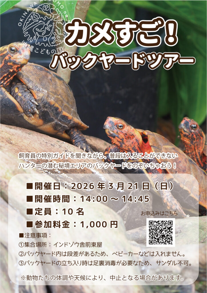 爬虫類担当の飼育員が、カメの魅力についてご紹介します。体の特徴やごはんの食べ方、沖縄に生息するカメについて、クイズを交えながら楽しく学べます。その後、ハンターの潜む秘境エリアのバックヤードにご案内。間近でカメの特徴を観察したり、実際にエサあげを体験したりしながら、カメについて深く理解できる体験プログラムです。