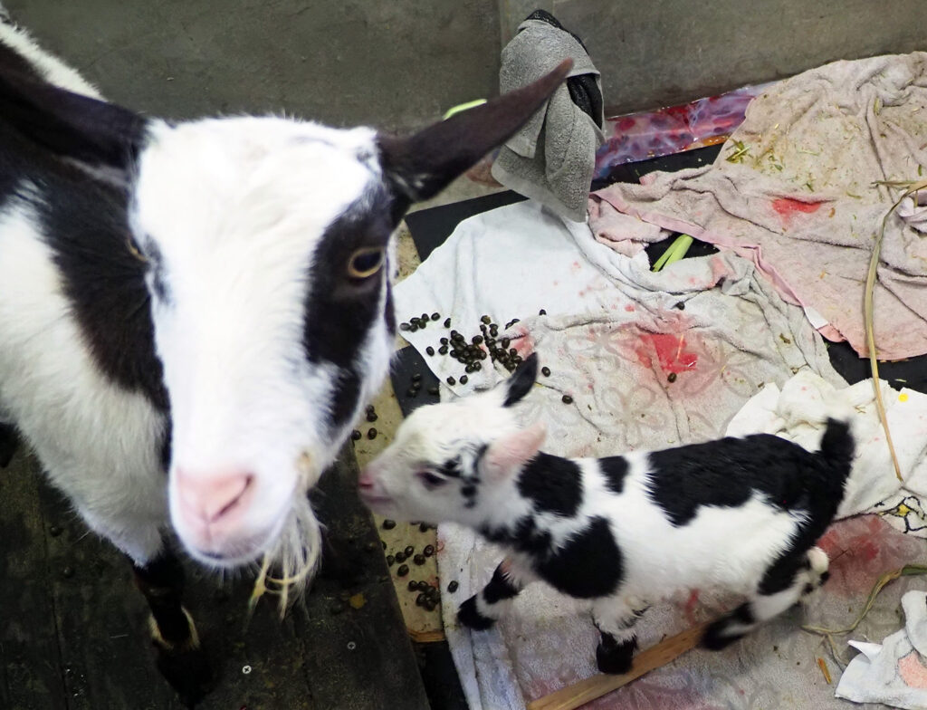 島ヤギの妊娠から出産までの様子を実際に見ること自体初めてであったため凄く緊張しました。何を準備するのか、どこまで飼育員が見守る・補助するかの判断を先輩飼育員や獣医から教わりながら、新しい命が生まれてくる瞬間に立ち会えたことはとても貴重な体験ができたと思います。母親であるカナサンは出産時に仔と距離をとる様子が見られましたが、翌日以降展示場では仔と一緒に歩いたり時々仔の様子を確認しながら面倒をみたりと母親らしい姿を見て安心ました。出産から現在まで親子共に元気で健康な姿を見ることができて嬉しいです。仔はオスで、カナサンの第1子であるダダと同じです。似たような性格になるのか、それとも全く違った性格になるのかこれからの成長が楽しみです。(いしい飼育員)