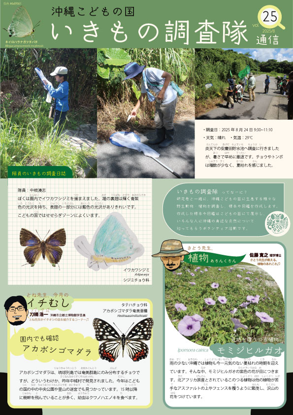 『沖縄こどもの国いきもの調査隊』ボランティア活動では、園内の昆虫や植物の生息域や増減を調べ、来園者のみなさまに身近な沖縄の自然について発信する活動をおこなっています。通信vol.25を発行しましたのでお知らせいたします。