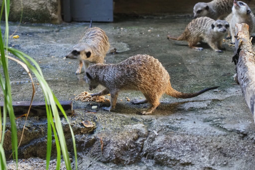 沖縄こどもの国で初めてとなるミーアキャットの展示が、「ハンターの潜む秘境」エリアでスタートしました。アフリカのサバンナ地帯に生息するミーアキャットを、6頭の家族単位で公開しています。穴を掘る姿や、周囲を見張る個体など、ミーアキャットならではの暮らしぶりを、間近でご覧いただけます。