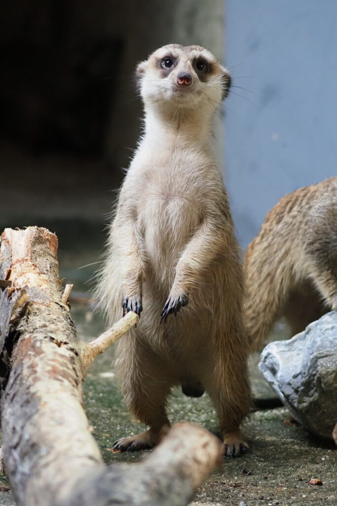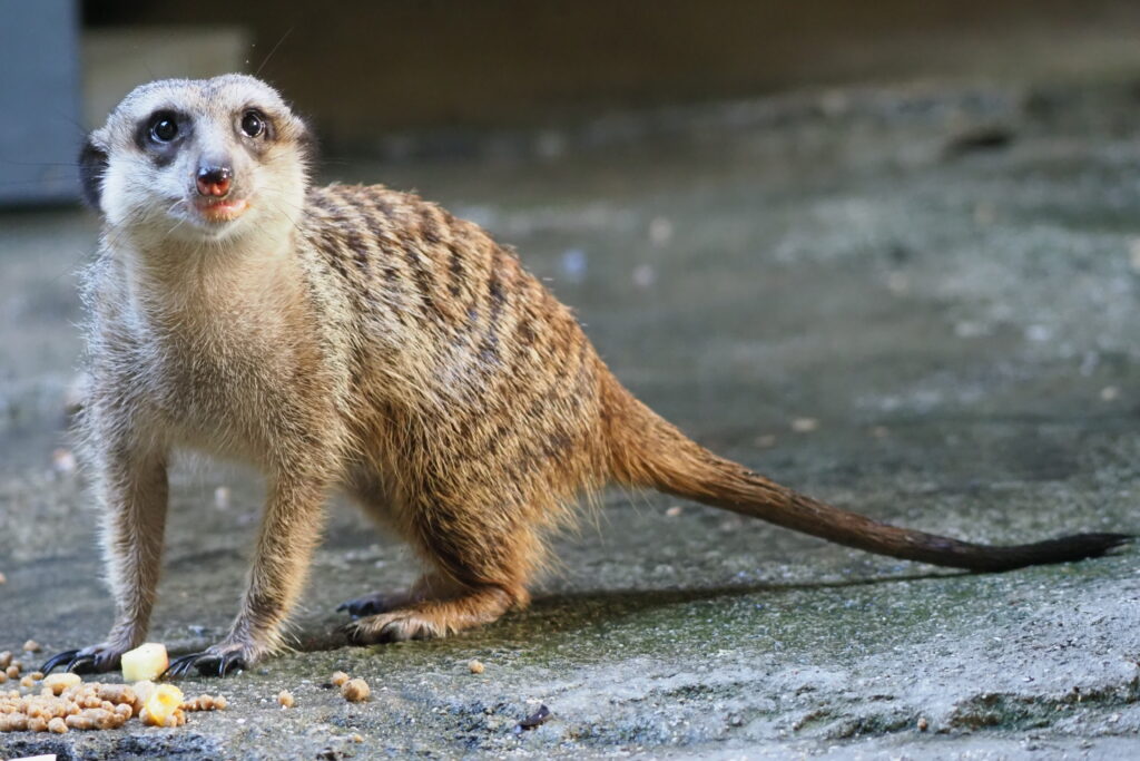 哺乳綱食肉目マングース科に分類されます。アフリカ南部の開けた荒れ地や乾いたサバンナに生息し、なわばり内に地下トンネルを掘って、10~30頭の群れでくらしています。群れの中では見張り役やベビーシッターなどの役割が分担され、助け合って生活しています。