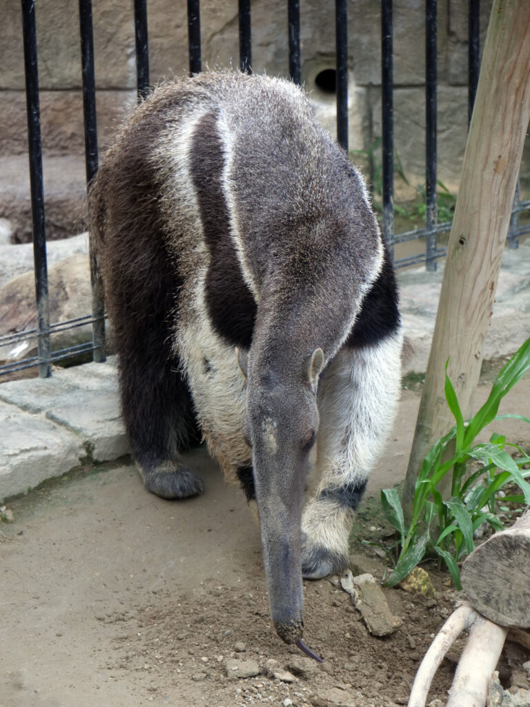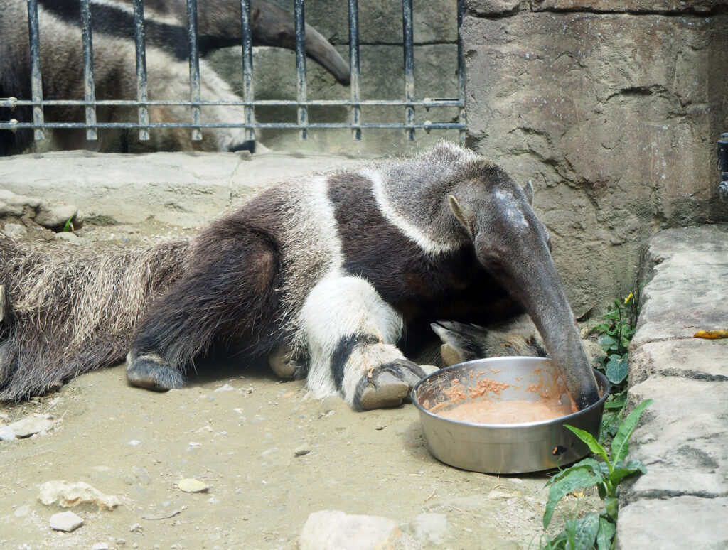 約60cmにもなる長い舌を使って、アリやシロアリを食べます。採食のしかたも少し独特で、野生ではひとつのアリ塚を壊して中のシロアリをすべて食べ尽くすのではなく、少し食べては移動し、また別のアリ塚で少し食べる――このように、移動を繰り返しながら採食します。動物園では、野生での採食行動に近づける工夫をしながら、馬肉ミンチや食虫動物用ペレット、ゆで卵の黄身、粉ミルクなどを混ぜた特製食を与えています。