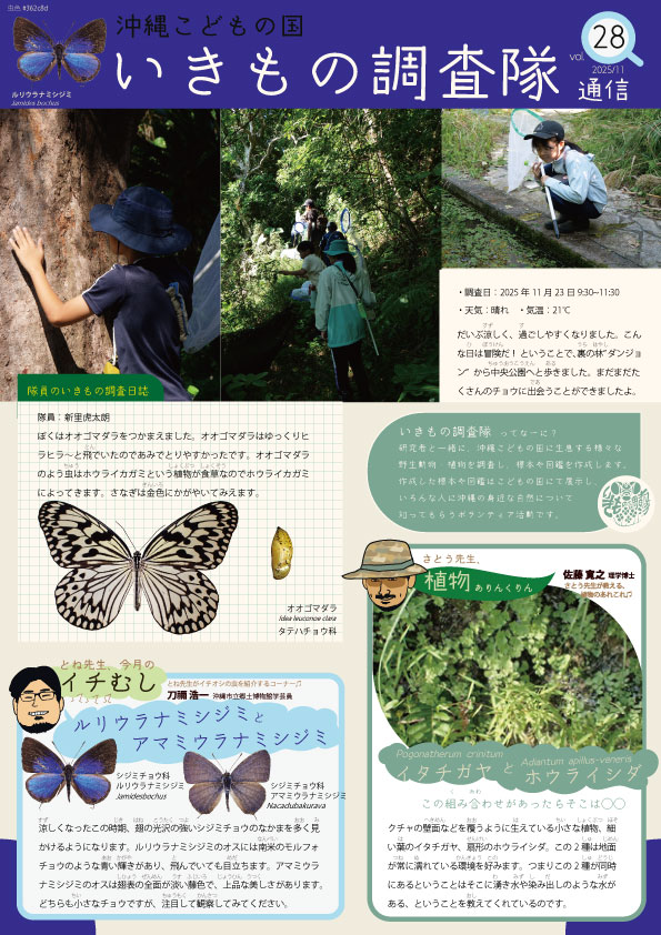 『沖縄こどもの国いきもの調査隊』ボランティア活動では、園内の昆虫や植物の生息域や増減を調べ、来園者のみなさまに身近な沖縄の自然について発信する活動をおこなっています。通信vol.28を発行しましたのでお知らせいたします。