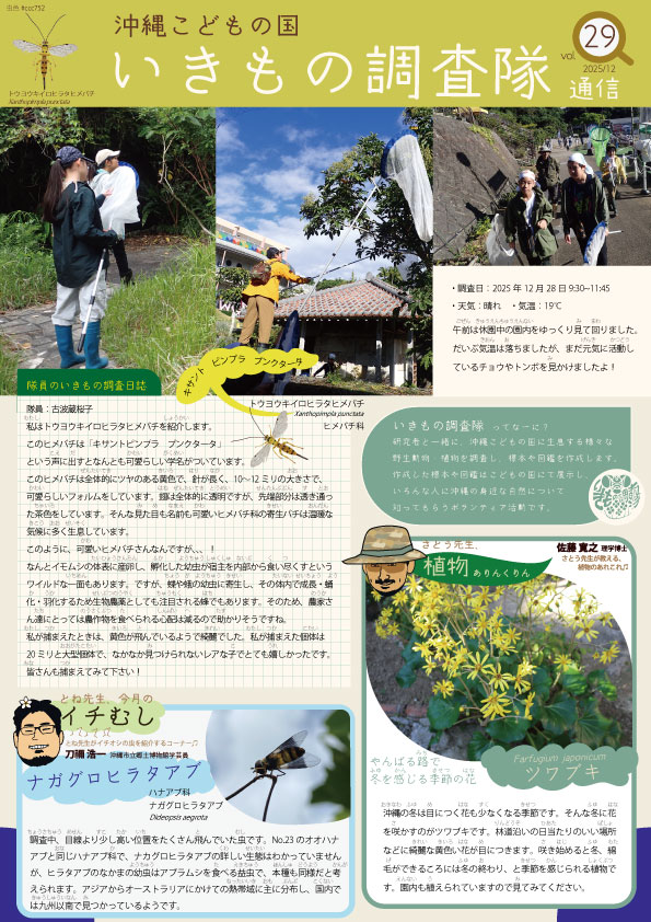 『沖縄こどもの国いきもの調査隊』ボランティア活動では、園内の昆虫や植物の生息域や増減を調べ、来園者のみなさまに身近な沖縄の自然について発信する活動をおこなっています。通信vol.29を発行しましたのでお知らせいたします。